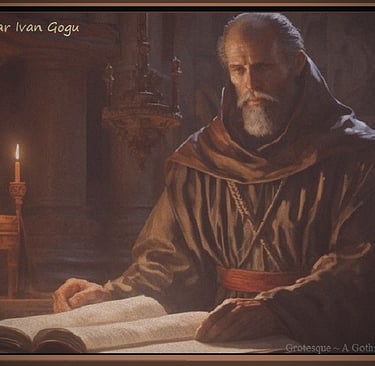 The pitch darkness surrendered itself to the light of a crackling torch held by the monk as he entered the room. He was tall, with broad back and deep chest, and the sadness in his deeply blue eyes belied the jovial smile on his lips. The well-groomed crop of silver hair, that crowned his head like the fallen halo of an angel, complemented his clean and close salt-and-pepper beard. A severely hunchbacked boy rose from the spring, a full pail of water at his feet. He wore a similar robe of rough-woven cloth as the friar, however, with a deep hood pulled forward over his head. A mask ~ a face cowl of the same cloth material covered the face of the child. Two circle holes existed where there might have been eyes, and a small flap of cloth covered the mouth. The dirty covering resembled the mask of a leper with a monk’s cowl draped about it. The boy was an apprentice, yet his quarters were not with the other abbey squires, aboveground. Lazarus lived here, within the catacombs, in a quaint room that Friar Ivan had appointed for him, replete with a rudely fashioned bed and thick blankets. Although he was thirteen years old, his slight stature and thin limbs made him appear much younger. Unknown to all the Abbey residents, save himself and friars Ivan and Odino, Lazarus was a Gogu ~ the misbegotten child of Ivan Gogu.