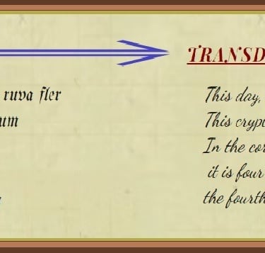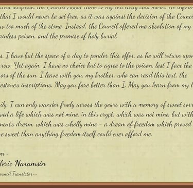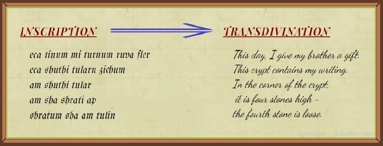 Then he backed away, centering himself over the desk - and there it lay. Lazarus wiped away a layer of dust. The remaining desk scratches took shape and he found, not random carvings, but orderly symbols. They were not hieroglyphic pictures, but rather were geometric figures. The position and spacing of them drove the pronunciation ~ and the meaning into Lazarus’ eye. In the recognizable pattern, circles and lines formed letters ~ words ~ and sentences. However, the inscriptions were neither French nor Latin, but of a language unknown. In truth, no man could have scribed the message on the desk, since its tongue was never born on earth. With some difficulty, Lazarus pronounced the words and discerned their meaning: