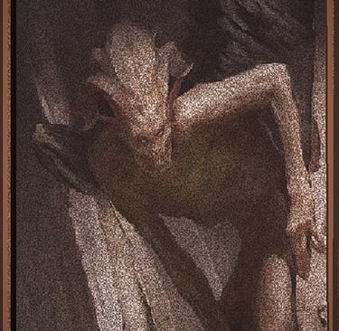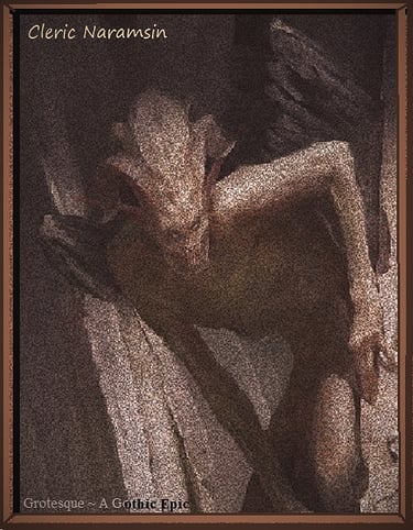 However, he found only a standing silhouette in the far corner. He stepped aside to allow the oil lamp to cast its rays and reveal the shadowy shape. His bones melted; horror consumed him, as might a river of burning tar flow over him. The spirit of the stone stood before him, thoroughly naked, with glistening black eyes, long hair, and grinning at his supple soul. The priest knew Her as all of the abbey monks knew Her: the fornicator of centuries old, the greatest Evil of Adam, and the sublime Mother and Incubus of all grotesques.