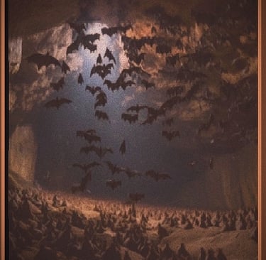 "The best way." Nicholas thrust the torch on high, revealing a high cavern ceiling completely filled with Greater Horseshoe bats. Lazarus stood in awe, looking over the upper cave formations as ten thousand shiny black eyes stared down at him.