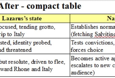 Lazarus, shaken by the fish house’s horrors and by Lucifael’s presence, throws off the crossbar and departs for Cancello, haunted and more deeply embroiled in her cause.