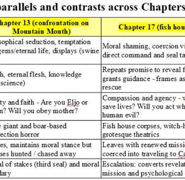 In Chapter 17 Lucifael reprises and intensifies the moral trial she first staged in Chapter 13, shifting from rhetorical seduction to situational coercion so as to compel Lazarus’s action. At Mountain Mouth she had argued, probed, and tempted him with vision and reward - “You are the only of my Eljo children ever to be born again” - leaving the ethical decision in Lazarus’s hands. By the fish house she executes a different strategy: she arrives through the tall ragged door and shames him with an accusation that collapses principle into immediate duty - “So close you were, Eljo. Yet you simply could not bring yourself to close the door even to save the lives of many.” The grotesque tableau of Amad’s stacked corpses and the fisherman’s self-righteous cruelty do two things at once: they force Lazarus to confront human vice as the immediate problem, and they make Lucifael’s demand for the Cancello seal appear urgent and pragmatic rather than purely philosophical. The result is a conversion of Lazarus’s agency - his refusal in Chapter 13 becomes a departure in Chapter 17 that is less a clear endorsement of Lucifael than a coerced movement through trauma, obligation, and the weakness of human institutions.