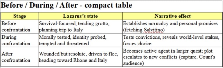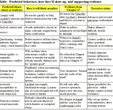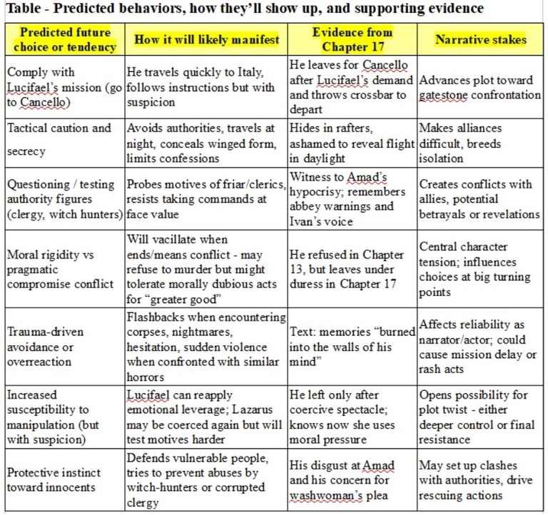 Below I map the immediate psychological, moral, and narrative consequences of what Lazarus does in Chapter 17 (leaving the fish house, throwing the crossbar, and accepting Lucifael’s demand by departing for Cancello), then translate those consequences into concrete predictions about his future choices and likely arcs.