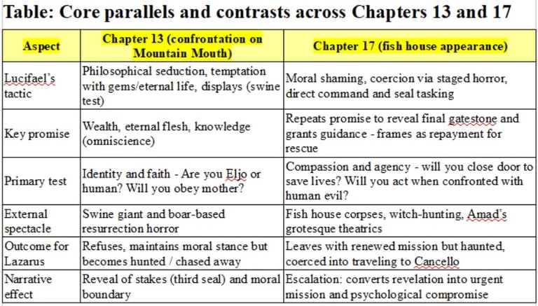 "Where Chapter 13 frames Lucifael’s assault on Lazarus as an intellectual and spiritual provocation, Chapter 17 converts that assault into tactical coercion, using staged human horror and moral blackmail to force Lazarus from principled refusal into urgent complicity."