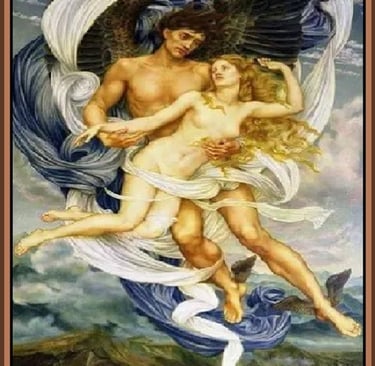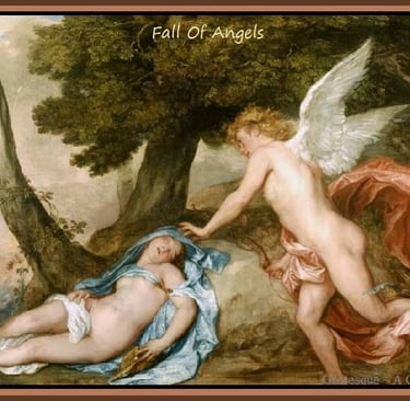 'Lucifael', Man called her instead, summoning her company in secrecy and dreams, and she came upon men to quench the fire of their desire for her, and these men sired her children a thousand, thousand~fold. These winged children were the Eljo that roamed the skies unopposed. Altogether, the Eljo would take to the heavens like a vast cloud of bright birds erupting skyward; and in flight, their great numbers cast a lingering shadow over the face of the earth. Man looked upon the Eljo, the many children of Lucifael, and found them to be wondrous. Even so, these were the last days of the earthly angels, as the three plagues of Darkness had settled over the hearts of Angels and Man. Destiny, Doom, and Death demanded an audience with each of them.