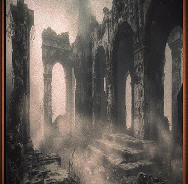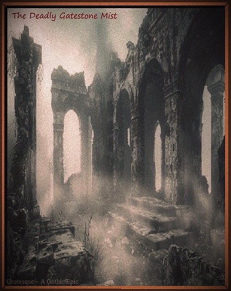 Captain Bourne’s mounds of mud had long since eroded from the exterior cracks of the cathedral, allowing adequate ventilation for the caustic abomination he had attempted to contain. Within the church and beneath its altar, the groans and cries of the whirling column continued, unabated by a six~ton capstone that exhaled a plume of death. The mist was a nightly recurring fog, behaving more like a predictable and ethereal nocturnal organism rather than a dissipating evening haze. At dusk, it stole its way from out of the cathedral and unfurled over the hillside as a rolling carpet of darkness so intensely black as to swallow all sheen and glimmer of light from every surface of water and stone. The mist draped its blistering self above the ground until the light of dawn, when it would surrender a scorched earth. Always, the deadly curtain withdrew up the abbey hillside and retreated into the cathedral to lay in wait for the following hint of dusk. The mist was scarcely recognizable as anything other than the turning of night, but like a persistent plague, it covered additional ground with every passing eve, steadily smothering the French countryside. In its wake, weeds and shrubbery browned and whole trees fell naked, ponds and streams festered, and every living thing ~ men to dogs, rats to fleas ~ surrendered its belly to the incessant presence. Altogether, the burning vapor seemed to serve as a devilish line of defense, offering an ever~expanding moat of death to protect the opened gatestone.