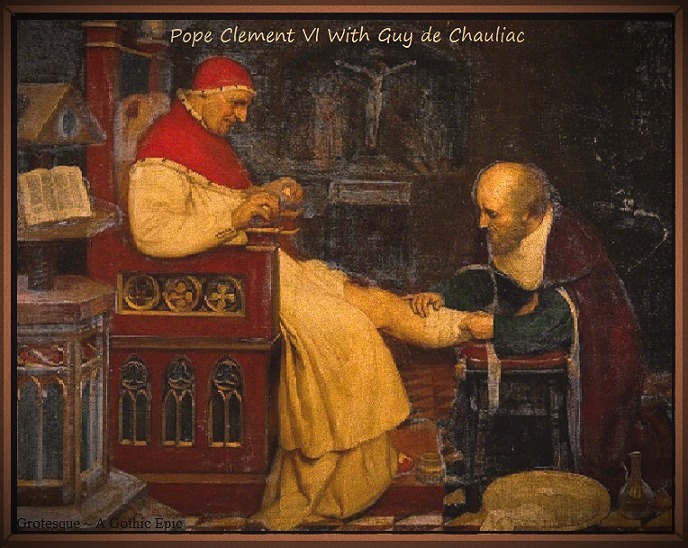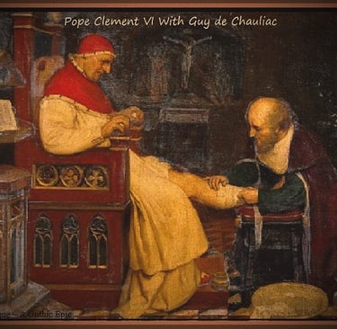 Lucifael’s unholy concoction ripped through the heart of the Holy See as well, and nine cardinals and half of Avignon’s priests were rolled into their graves. But the pestilence failed to take the life of their appointed Holy Father on earth, as Pope Clement fled the Papal Palace under cloak of darkness, shielded by his secretly appointed assembly of guards and physicians. The dying dignitaries and sickly nobility, who clung to the palace gates and pleaded for Clement’s pontifical absolution and last rites, had no idea that he had abandoned the city several days prior. And when they discovered he had escaped, they were told that he had relocated to the northern city of Valence, but in truth, Clement secluded himself in the more distant and remote alpine village of Grenoble, settling in between two ever~burning fireplaces and within a circle of choice physicians led by Guy deChauliac. Aside from his ability to keep secrets within the papacy, he was a skilled physician and personal favorite of Clement ~ a master French physician who routinely treated Clement and several of his cardinals. With his immediate needs attended to, Clement governed the Holy See remotely via written correspondence to Cardinal Firmus, who remained in the Papal Palace to enforce the Pope’s mandates.