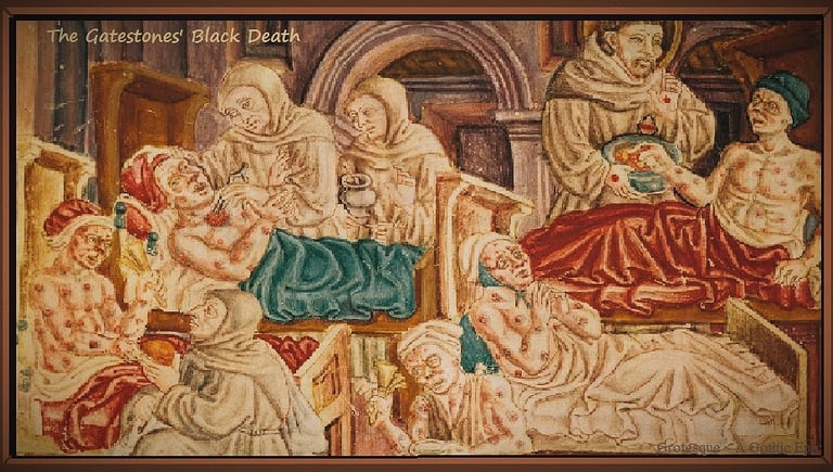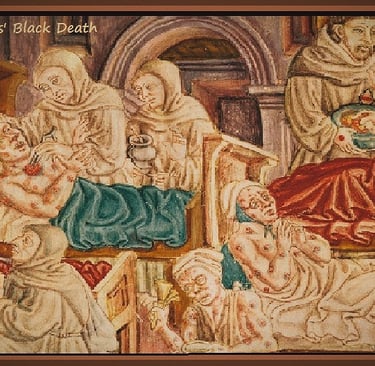 Even as increasing numbers of villagers learned of the creeping caustic mist and its infamous flying statues, and had means to flee these growing monstrosities, few villagers escaped the omnipotent and deadliest of hell's designs. The Great Pestilence was as a dragon that rose from out of the Black Sea, having three distended heads with three names: Bubonia, Pneumonia, and Septicemia. The three~headed monster rode the black rat and would be named by the French the Black Death, and Hell followed with it. ’Twas a devil’s brew, indeed. Even as sixty~six percent of Asia lay under the fetid stench of death, Lucifael's appetite for Man’s soul was only half~whetted. She wanted all of Him with her, forever imprisoned. Thus, in 1347, in the last days of the month of October and beneath a large harvest moon, the Black Death charged down the Santa Godeberta's hawsers, down the ship's tie~ropes, and against all the people of Europe. In mere days, Lucifael’s lethal concoction suffocated the bustling seaport of Messina and blew inland like a poisonous sea breeze.
