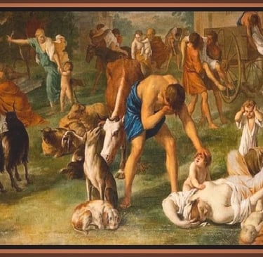 “They are like a line of ants. Who shall bury them all?” Blasi murmured; his glassy eyes fixed into the distance. On the main road that marked the beginnings of the Blasi estate, a steady progression of plague~infected passersby lined the lane. From Blasi’s high and distant vantage point, he saw them as but an unending row of ghostly insects, steadily drifting out of the city before disappearing into the countryside. Young and old, rich and poor, men, women, and children ~ altogether and outwardly moving like the last strides of an entire city, since condemned to the gallows. In the mass exodus, most of them strode on foot, carrying what little they could. Others, who could barely carry themselves, stumbled forth like walking death. Occasionally, overloaded horse~drawn carts sliced through the center of the northerly~drifting column, their wheels barely skirting days~dead corpses that dotted the roadside. Blasi wiped the fog from the windowpane. “Where is there enough blessed ground to inter an entire town ~ or countless cities, even? ‘Tis immeasurable madness; this pestilence is.”