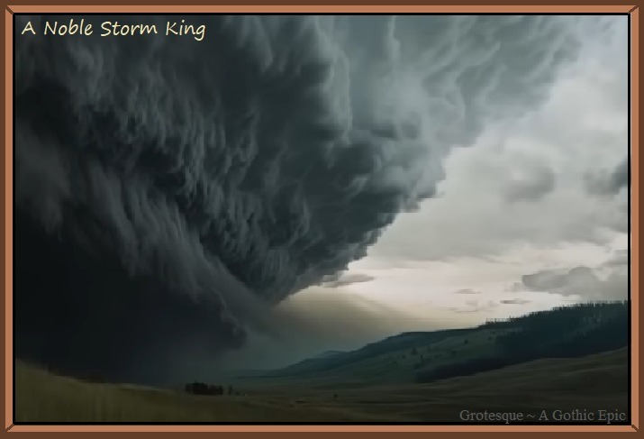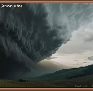 Where the silhouette once stood, a winding and twisting cyclone descended from the heavens, swelled into an ebony nightmare, and wandered northward up the rear wall of the thunderstorm. Altogether, the swirling gloom towered three miles high whilst commanding no less than a quarter~mile of ground. Apparent as the Finger of God, the pillar scoured a polished line across the earth and, like fat insect feelers inspecting the ground, bolts of lightening streamed, whipped, and spewed from the monstrosity. Wholly, the sluggish column heaved and twisted, lugging itself forward like a meandering old man on a cane stick.