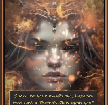 Then she stopped, leaned in his face, and whispered, “I am here to discover what you do know. You are the only of my Eljo children ever to be born again ~ the only one who has ever carried the Glow of the Throne about him. Yet in stone, you could neither resurrect yourself, nor cast the Glow upon your own head. As well, ‘tis remote that such happening occurred by chance alone. Now, I want you to share with me the one who brought you back.” Lucifael spurred his thoughts, “Recall everything for your dear mother, Lazarus. Who raised you? Was it a holy man, or a mystic of magic?” She cocked her head and searched his face, looking deeply for clues sunken beneath the oceans of his blue eyes.