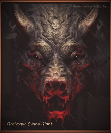 Completely erect, with two bristly pillars for legs, the swine giant towered twenty feet tall in the forty~foot grotto. Tilting a black eye down at Lazarus, the monster growled; its deep expression resonated through every surface of the cave. Lazarus glanced at the grotto entrance and the giant responded, stomping toward the opening, blocking all escape. Lazarus hissed and backed deeper into the shadows; ears flat like a cornered cat.