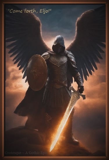 At the southernmost edge of the valley of stones, atop a craggy ridge and against the passing backdrop of a brilliant flash of lightening, there towered the silhouette of an enormous knight, all of forty~five hands tall. Encased in armor black as pitch, the giant wielded a long~sword that, from tip to grip, stretched longer than a man stood high. And in a sweeping thrust, which perhaps seemed to cleave the clouds, the giant drove his blade to the heavens, bellowing in a deep and foreign synchronized voice, as of many giant men speaking at once; “Eljo! Come forth!” In a violet flash, lightening crashed into the sword and the silhouette exploded into nothingness. Yet the squall’s chaos continued: winds climbed and hail fell as rains whipped to~and~fro.