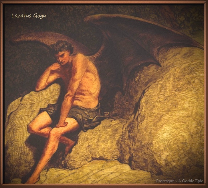 Lazarus spun around; his breath left him like a soul torn as Lucifael stood arms reach from him, thoroughly naked and grinning slightly to expose, between crimson lips, the thick tips of canine~like fangs. Beneath her wild hair, a pair of wholly black eyes reflected an inverted image of the cave fire, with upended flames dancing downward in bluish hues. Moreover, with ebony nails and scarlet areolas against ivory skin, and with enormous wings of layered flesh and bone sprawling above and behind her, Lucifael could perhaps mock Purity by her presence alone.