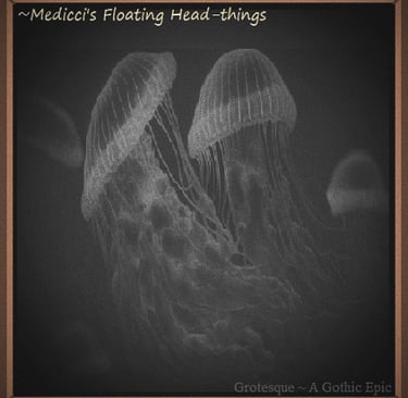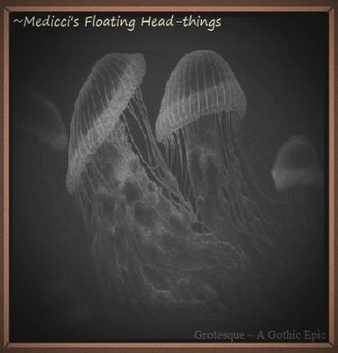 "Especially so," Medicci affirmed. "I have witnessed great monsters lurking in the deepest hollows: white giants with massive heads and no bodies; and many long and loose legs stemmed from it ~ legs so exceedingly long that they could have spanned the entire length of the largest ocean~going trade ship. And I have seen enormous ghostly bodies with no heads, which appeared as nothing more than massive swimming hats stuffed with long, flowing hair ~ glowing hair that slew its prey. I also saw massive, toothless sea bats with gaping mouths and long tails. And once, I happened upon a sprawling sea bed of giant clams; the largest of them could have devoured the whole of two men in its abruptly closed shell." Medicci huffed and winced, adding, "Then there were those pale and hideous head~things~" He shuddered in expressed revulsion before continuing, "~they were as floating heads, sporting rows of irregular teeth; and their oversized eyes and gaping mouths consumed nearly all of their being. Big~eyed, many~toothed heads, they were. Gather, if you will, an undersea world, black as pitch, and filled with ferocious and voracious, glowing and floating heads."