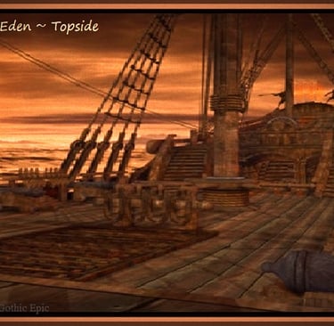 "Eden," Medicci retorted with quick completion. He pointed over Lazarus' shoulder, toward the bow. "'Tis the ship's name. Whilst you slept, I ventured about for further inspection; and her existent condition reveals much about her past."