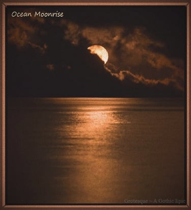 Lazarus wandered warily toward the raised front of the ship. His clothes whipped in a warm and steady breeze that blew seaward from the mainland. He stopped near the bow and studied its keel, which bore the partial carving of a woman's nude backside, now broken away at the waste line. "The jewel," Lazarus murmured, looking about the deck for remnants of her upper torso, only to find splintered wood and scattered rope. He turned toward the sea, combed the windblown hair from out of his face, and held it against the top of his head. From his new vantage point on the foredeck, and with him peering around the lower northern side of the seaward island, he spotted the dawning and luminous face of the moon. A reddish and hazy halo encircled the orange orb, giving the heavenly body an ominous and wraithlike facade. Lazarus stood, immobile as a statue, as he came to terms with the wide and pitch gulf before him. At length, he inquired; "How deep is the ocean?"