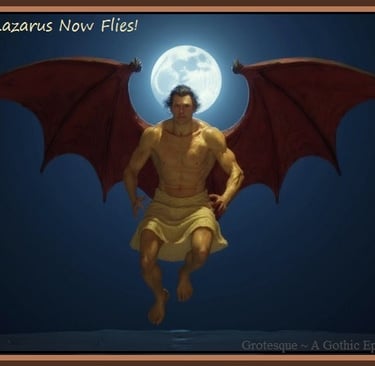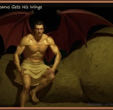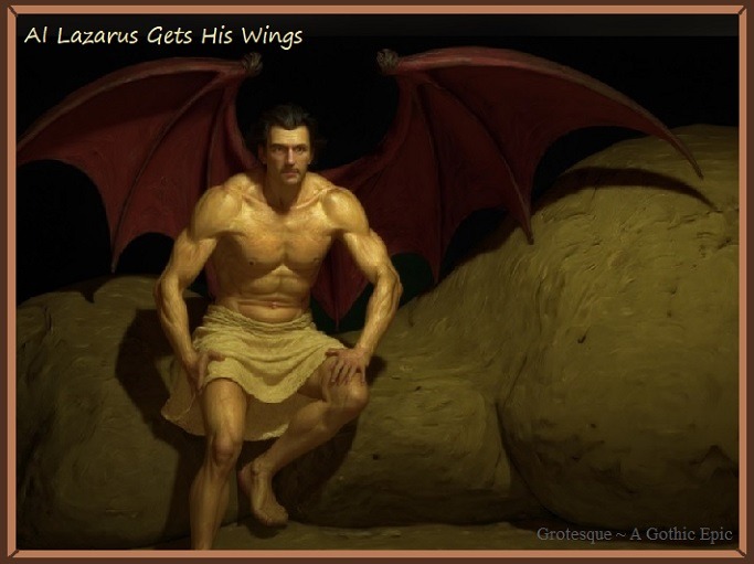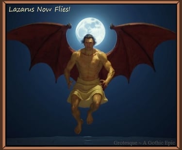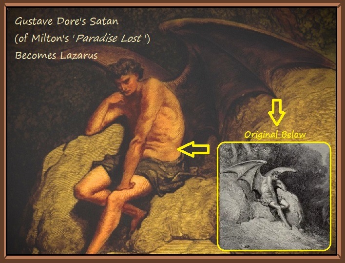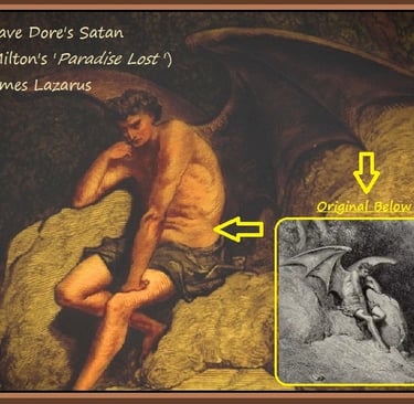 Just as Lazarus' juvenile image was selected from historical artwork, so too was Lazarus' mature image was selected from historical images and used as a baseline (after his resurrection in Volume I of Chapter 13). In this case, a particular sketch by Gustave Dore was used, featuring an engraving of Satan as depicted in John Milton's published work: Paradise Lost. The image can be seen below. Gustave's B&W sketch was used in the original website illustrations to depict Lazarus, long before AI entered the picture. And even today, just like a century ago, it is still almost impossible to find decent public domain illustrations of flesh-winged humans. I am sure that Gustave Dore received quite a bit of attention with his illustrations, during his time, given the rarity of such a depiction. Nevertheless, Lazarus (the adult) was created from the mind of Gustave Dore, over a century before Lazarus was finally resurrected through AI. Dore's depictions are below: