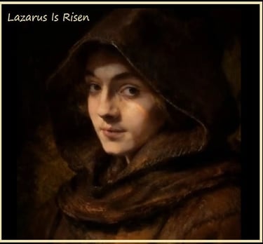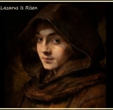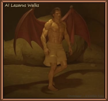 When AI services were first introduced to the wider public, the character images from Grotesque ~ A Gothic Epic were uploaded for AI rendering, in order to give them a more life~like appearance (vs. painted images). After several renderings using AI, Lazarus was now free from the Rebrandt's canvas and, he now existed in a reproduced digital format. Several different static images were created, giving Lazarus a portfolio of still images, with slight variations between them. It would serve the purpsoe of dropping images into the online work that were somewhat unique (instead of using the same portrait repeatedly). This was a notable improvement from the single static image of Rembrandt's painting; however, Lazarus still wasn't 'alive', so to speak. Below is a copy of one of those AI static image renderings.