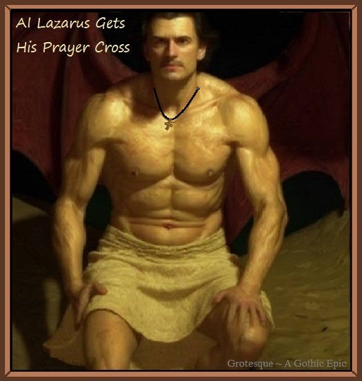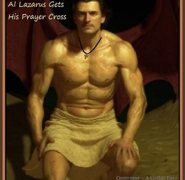 And finally, we know that AI can provide audio content as well as video content. You might now be wondering what Lazarus and Odino sound like, especially after watching them come to life right in front of you. Would you care to hear them? How about a nice private conversation between the two of them, which actually occurs in Chapter 3 of Grotesque, A Gothic Epic? The conversation was created this way ~ initially, the character's voices (tones, inflections, pitch, speed, clarity, etc.) were chosen which Graven thought would best fit the two characters that he had already constructed in his mind. Then, an exchange between them was identified in chapter 3 of the work, which also contains very important clues regarding subsequent events within the work. The words from each character's dialogue was extracted into two separate text documents. Each document contained only those of a single character, and each sentence was placed on a single line, in exact dialogue sequence. The end result: one file with strictly Lazarus' sentences, and another file with strictly Odino's sentences. The files were provided as input for AI text~to~speech services. The resulting speech files of the two chosen voices was supplied as 2 Mp3 files. These files were sliced up into smaller Mp3 files, and then reassembled and stacked between one another, within a single audio file via audio editing software. The resulting effect was the simulated but realistically-sounding conversation between Lazarus and Odino, And to put the icing on the cake, sound effects were overlaid within the conversation to give the listener the audio appearance of a setting, and a conversation occurring within that setting. The Mp3 download link is provided below.
